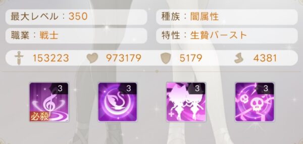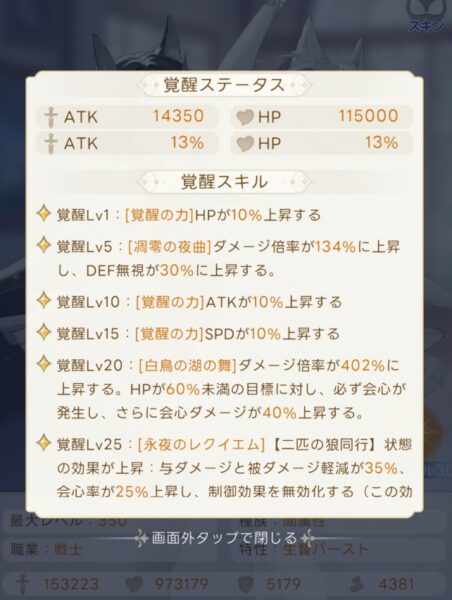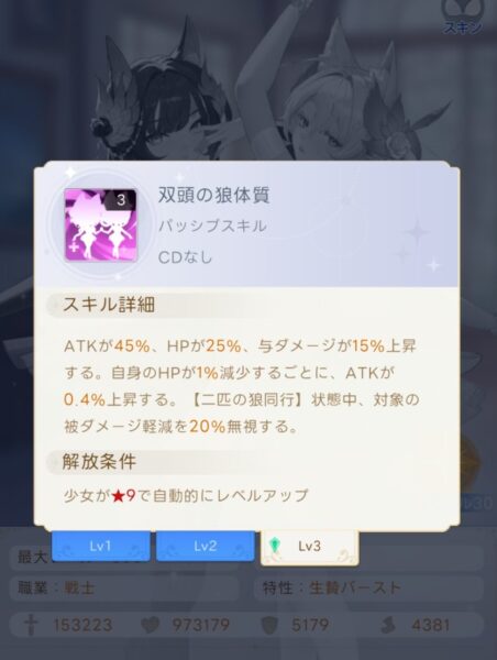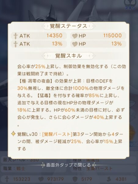 ATKが45%、HPが25%、与ダメージが15%上昇する。