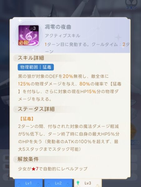 黒の狼が対象のDEFを20%無視し、敵全体に125%の物理ダメージを与え、80%の確率で【猛毒】を付与し、さらに対象の現在HP15%分の物理ダメージを与える。