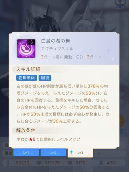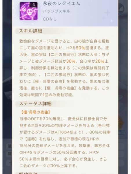 白の狼が敵のHP割合が最も低い単体に378%の物理ダメージを与え、与えたダメージの50%分、自身のHPを回復する。目標をキルした場合、さらに味方全休のHPを与えたダメージの50%分回復する。